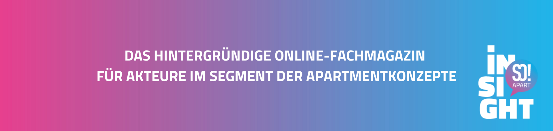Seit 2021 gibt es unser Online-Fachmagazin SO!APART insight. Hier erhalten Sie Informationen aus der Welt der Apartmentkonzepte. Dort erfahren Sie in hintergründig recherchierten Beiträgen Neuigkeiten aus dem Markt, Informationen zu geplanten und umgesetzten Vorhaben und finden zahlreiche Artikel, Interviews und Podcasts über und mit Akteuren der Branche, Veranstaltungshinweise und vieles mehr.